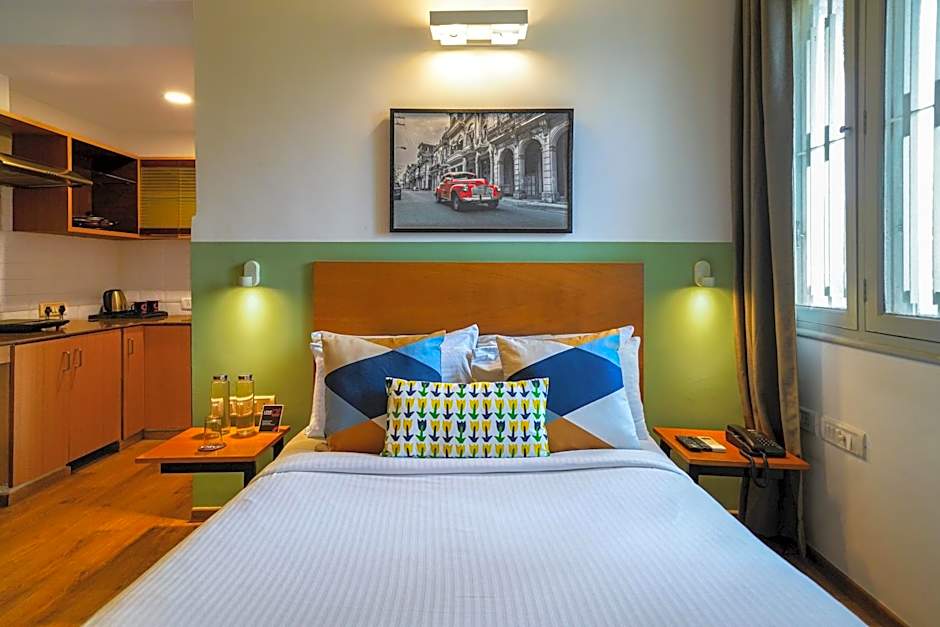 Accommodations span a satisfying spectrum: Studio rooms around 301–302 square feet with a queen-size bed and room for two adults and one child; the 1-bedroom Apartment around 399 square feet; a 398-square-foot Apartment, 1 Bedroom, Single Use; a 420-square-foot Superior Apartment; and even more expansive options like the Suite, 1 Bedroom with a City View. Some layouts feature balconies, and city-view options promise a memorable Bengaluru backdrop.